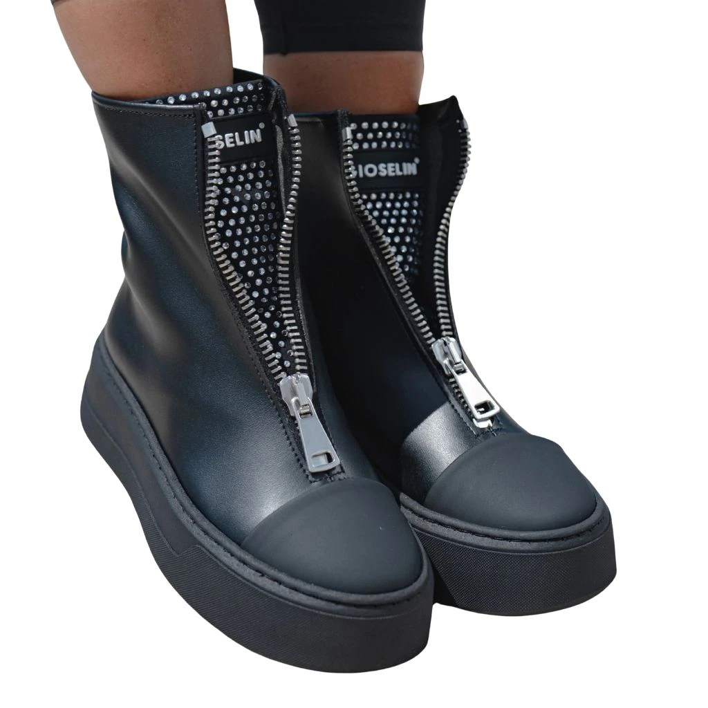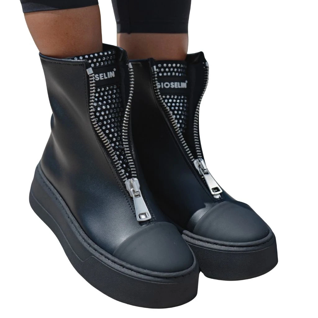 Questa scarpa è pensata per chi ama osare con stile, combinando l’eleganza del total black con l’effetto gioiello che cattura lo sguardo. Il doppio zip frontale completamente apribile permette di regolare l’indosso e di svelare o nascondere il dettaglio brillante a seconda del mood della giornata.