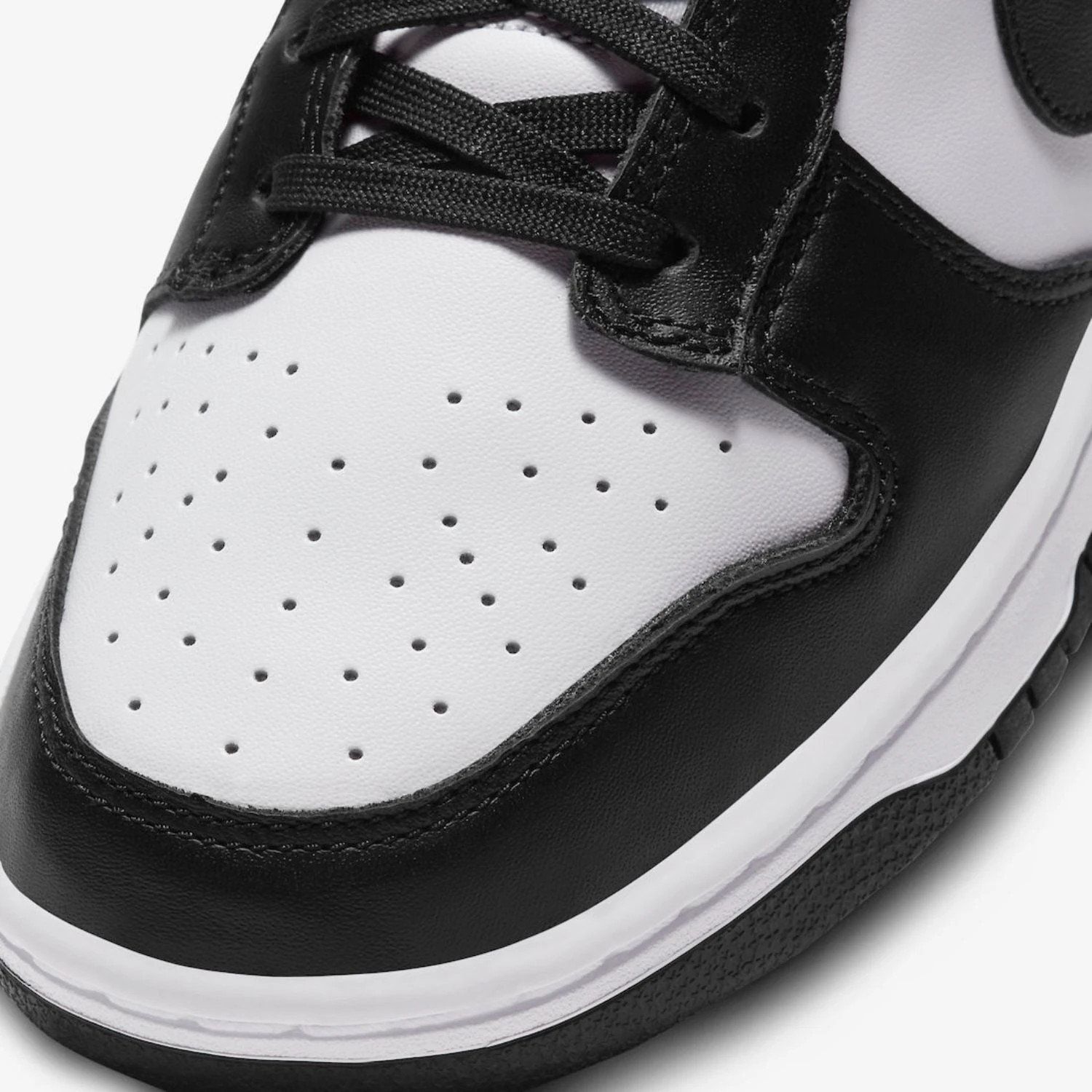La scarpa presenta una base in pelle bianca con sorprendenti sovrapposizioni nere sulla punta e sul tallone. Il marchio Nike bianco sull’etichetta della linguetta intrecciata e sulla linguetta del tallone risalta sullo sfondo nero. Il design è completato da un’intersuola bianca abbinata a una suola in gomma nera.